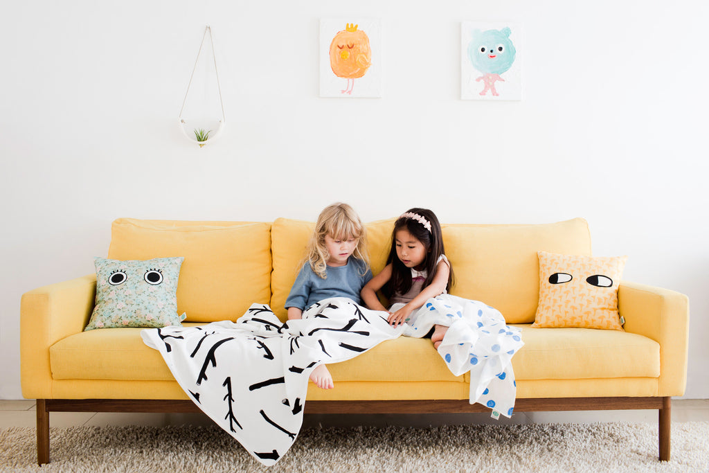 Mormor (grandma) pillows are inspired by vintage fabric designs. Grandma's pillows have come to life! Open eyes on one side and sleepy eyes on reverse. This fun playful pillow looks awesome with our bedding or anywhere in the home!