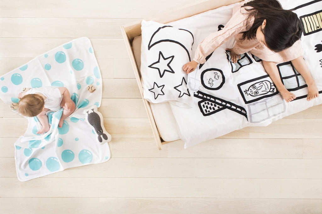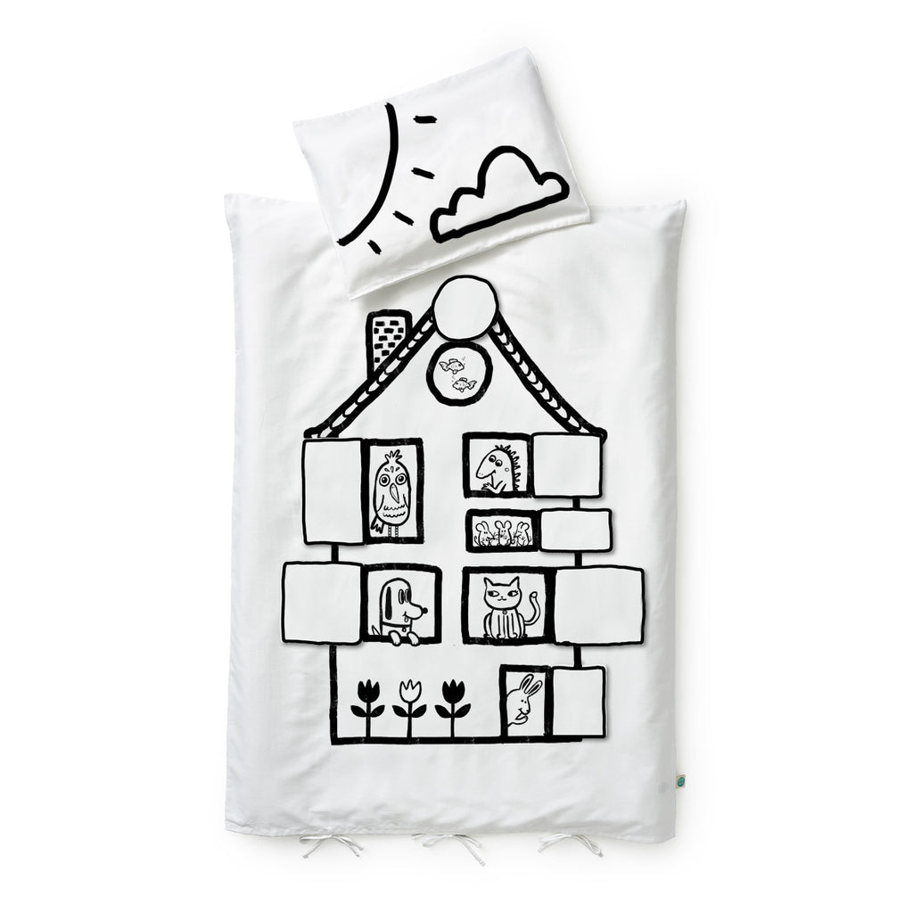 Natti Natti duvet sets are made of super soft organic cotton. One side is hand screen-printed and the reverse is white. Make 3 pretty bows with the ties at the bottom to close.